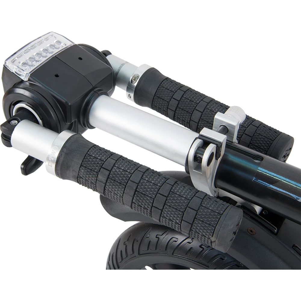 Электросамокат Generic E-twow S2 ECO легкая версия, его масса 10.5 кг. В сложенном состоянии занимает очень мало места. Легко носить в руках, нет проблем с хранением. Не смотря на вес, усиленная конструкция самоката выдерживает нагрузку 120 кг. Это отличительная черта E-twow.